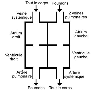 Le coeur distribue le sang à toutes les parties du corps humain. Les deux cavités, droite et gauche, fonctionnent simultanément. La cavité de droite reçoit le sang pauvre en oxygène et l'envoie aux poumons. La cavité de gauche reçoit le sang riche en oxygène provenant des poumons et le dirige dans tout le corps.